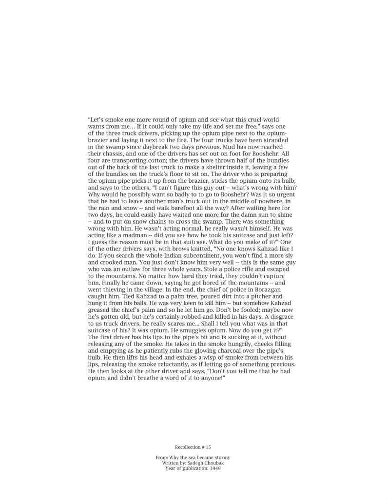 The following four texts are selected from an on-going archive we have been developing since 2016. The texts are written description of scenes of opium smoking in early modern to contemporary Iranian fictions. Each text is a third-person account abstracted from the original smoking scene. Reading them together one follows...